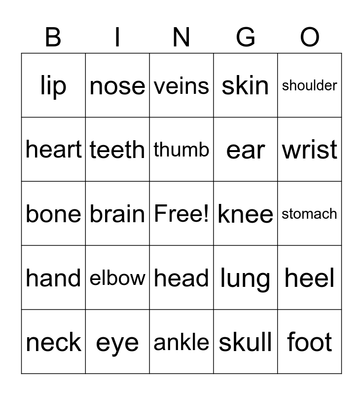 This bingo card has a free space and 24 words: elbow, eye, thumb, neck, shoulder, lip, heart, nose, knee, head, ear, bone, lung, heel, teeth, skull, stomach, veins, wrist, brain, foot, hand, skin and ankle.