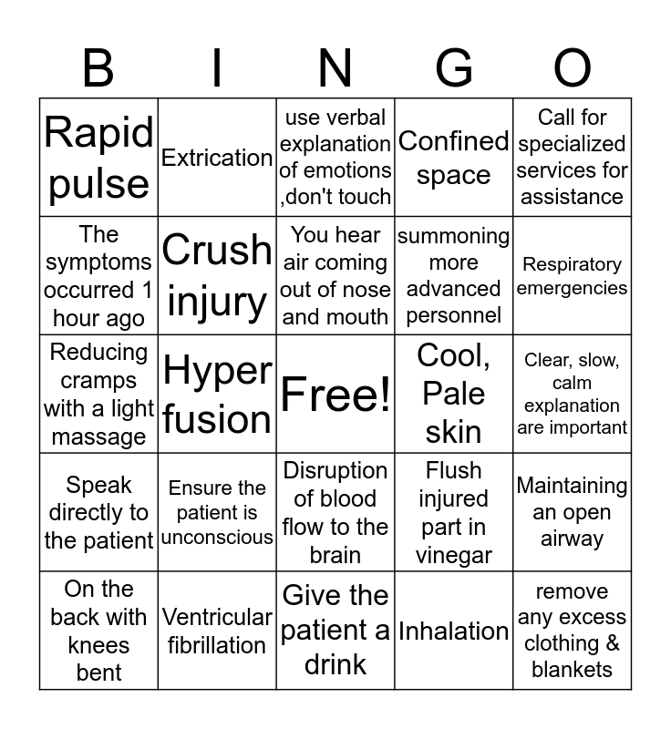 This bingo card has a free space and 24 words: Ensure the patient is unconscious, Ventricular fibrillation, You hear air coming out of nose and mouth, On the back with knees bent, Call for specialized services for assistance, Rapid pulse, The symptoms occurred 1 hour ago, Extrication, Cool, Pale skin, Disruption of blood flow to the brain, summoning more advanced personnel, Reducing cramps with a light massage, Flush injured part in vinegar, Maintaining an open airway, Crush injury, Inhalation, Clear, slow, calm explanation are important, use verbal explanation of emotions ,don't touch, Respiratory emergencies, Hyper fusion, remove any excess clothing & blankets, Speak directly to the patient, Confined space and Give the patient a drink.