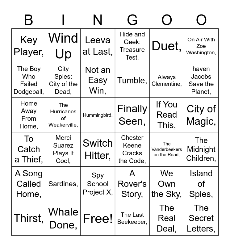 This bingo card has 40 words: Free!, Always Clementine,, Big Tree,, The Boy Who Failed Dodgeball,, Chester Keene Cracks the Code,, City of Magic,, City Spies: City of the Dead,, Coming Up Short,, Duet,, Finally Seen,, haven Jacobs Save the Planet,, Hide and Geek: Treasure Test,, Home Away From Home,, Hummingbird,, The Hurricanes of Weakerville,, If You Read This,, Island of Spies,, Key Player,, The Last Beekeeper,, Leeva at Last,, Merci Suarez Plays It Cool,, The Midnight Children,, Not an Easy Win,, On Air With Zoe Washington,, The Real Deal,, A Rover's Story,, Sardines,, The Secret Letters,, A Song Called Home,, Spy School Project X,, The Superteacher Project,, Switch Hitter,, Thirst,, To Catch a Thief,, Tumble,, The Vanderbeekers on the Road,, We Own the Sky,, Whale Done,, Wind Up and Girl on the Lake..