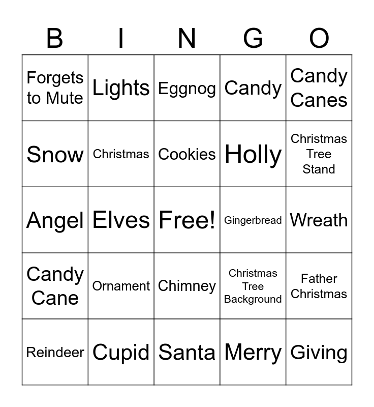 This bingo card has a free space and 73 words: Heidi Sings, Someone Burps, Forgets to Mute, Drinks on Camera, Animal on Camera, Ugly Sweater, Candy Cane, Snorts while Laughing, Christmas Tree Background, Spills Drink, Tree, Holiday, Christmas, Wreath, Bulb, Lights, Santa, Snow, Snowman, Gingerbread, Cookies, Candy, Candy Canes, North Pole, Reindeer, Dasher, Dancer, Prancer, Vixon, Comet, Cupid, Donner, Blitzen, Rudolph, Elves, Sleigh,, Workshop, Presents, Giving, Star, Merry, Ornament, Milk, Bells, Candle, Holly, Eggnog, December, Family, Angel, Birth, Candy, Carolers, Carolling, Carols, Celebrate, Chestnuts, Chimney, Christmas, Christmas Card, Christmas Carol, Christmas Eve, Christmas Tree, Christmas Tree Stand, December 25th, Elf, Elves, Family, Father Christmas, Feast, Festive, Frankincense and Frosty the Snowman.