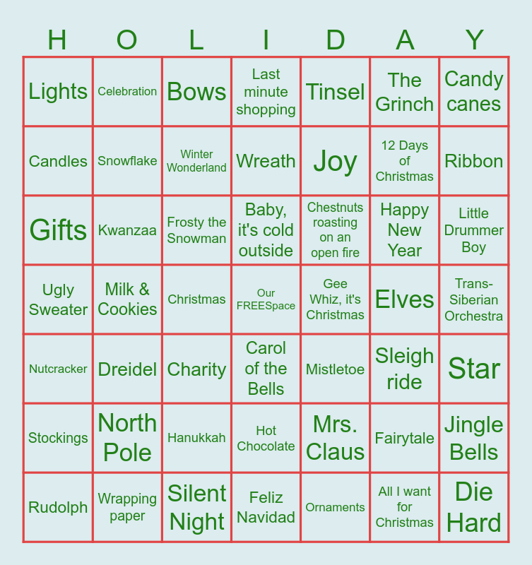 This bingo card has a free space and 55 words: Ornaments, Little Drummer Boy, Christmas Vacation, Lights, Milk & Cookies, North Pole, Candy canes, Chimney, Snowflake, Hanukkah, Last minute shopping, Star, Trans-Siberian Orchestra, Elves, Rudolph, Nutcracker, Tinsel, Joy, All I want for Christmas, 12 Days of Christmas, Ribbon, Dreidel, Chestnuts roasting on an open fire, Bows, Boxing Day, Candles, Christmas, Menorah, Gifts, Happy New Year, Santa Claus, Sleigh ride, Jingle Bells, Wrapping paper, The Grinch, Wreath, Stockings, Kwanzaa, Die Hard, Charity, Celebration, Hot Chocolate, Mrs. Claus, Vacation, Frosty the Snowman, Ugly Sweater, Silent Night, Mistletoe, Gee Whiz, it's Christmas, Winter Wonderland, Carol of the Bells, Fairytale, Feliz Navidad, Baby, it's cold outside and Gingerbread Man.