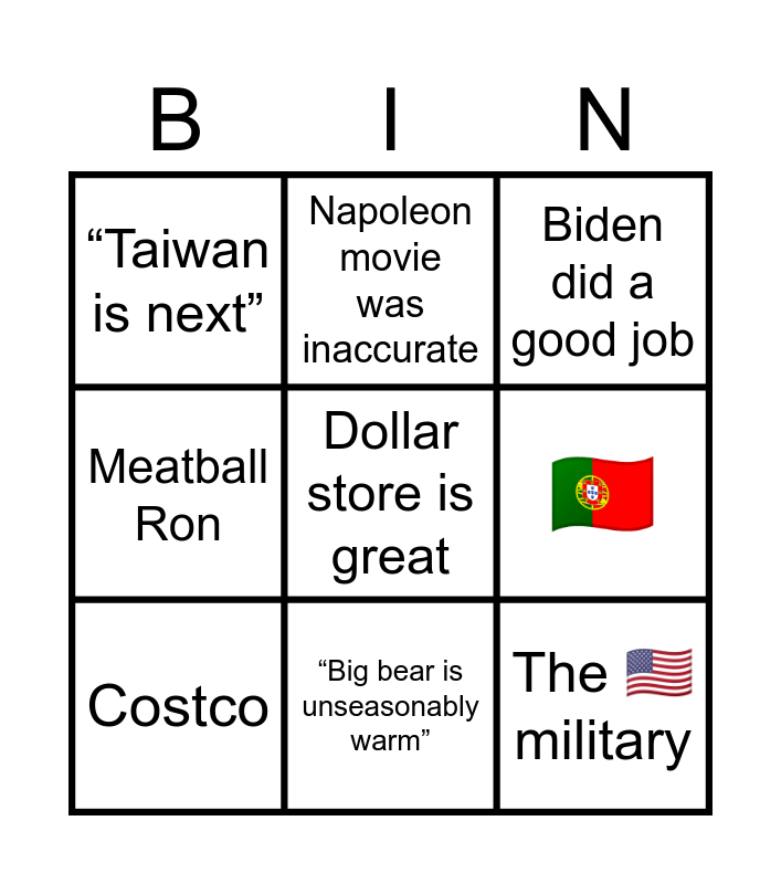 This bingo card has a free space and 8 words: 🇵🇹, Biden did a good job, Napoleon movie was inaccurate, Costco, “Taiwan is next”, The 🇺🇸 military, Meatball Ron and “Big bear is unseasonably warm”.