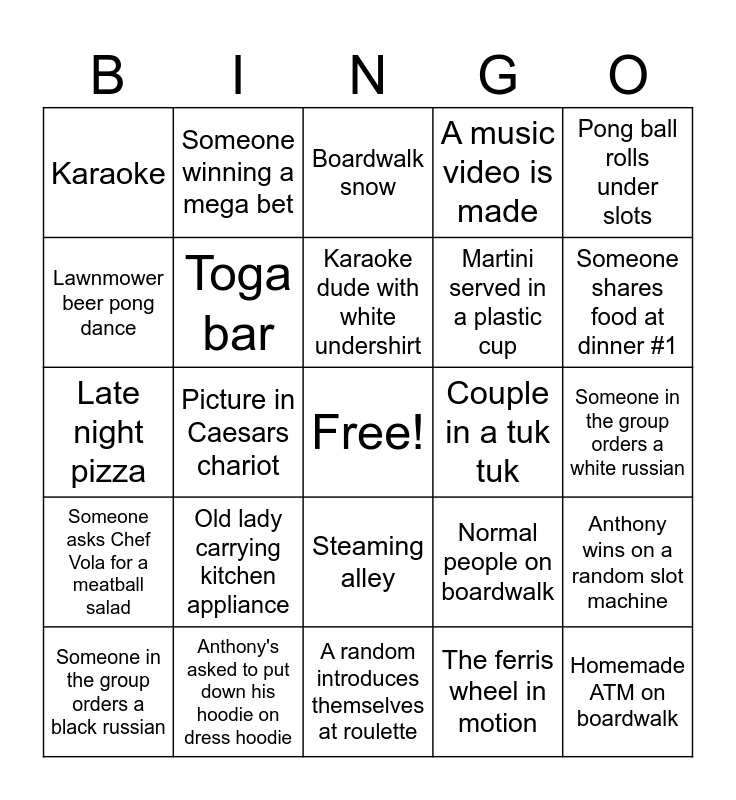 This bingo card has a free space and 24 words: Old lady carrying kitchen appliance, Anthony's asked to put down his hoodie on dress hoodie, Karaoke dude with white undershirt, Someone in the group orders a black russian, Pong ball rolls under slots, Karaoke, Lawnmower beer pong dance, Someone winning a mega bet, Couple in a tuk tuk, Steaming alley, Martini served in a plastic cup, Late night pizza, Normal people on boardwalk, Anthony wins on a random slot machine, Toga bar, The ferris wheel in motion, Someone in the group orders a white russian, Boardwalk snow, Someone shares food at dinner #1, Picture in Caesars chariot, Homemade ATM on boardwalk, Someone asks Chef Vola for a meatball salad, A music video is made and A random introduces themselves at roulette.