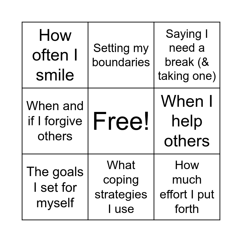 This bingo card has a free space and 29 words: Getting Enough Sleep, How I "talk" to myself, How I interpret events, How I take care of my body, How often I smile, Saying I need a break (& taking one), The goals I set for myself, Where I work, Treating myself with kindness, How I do my job, How I respond to my feelings, When I ask for help, Whether or not I keep my word, Who my friends are, When I take mindful breaths, Reminding myself I am enough & worthy, Owning up to my mistakes, How truthful and honest I am, How much effort I put forth, Whether or not I accept myself, When and if I try again, How I respond to challenges, Treating others with kindness, When I help others, When and if I forgive others, Setting my boundaries, When I practice gratitude, What coping strategies I use and Whether I focus on the positives or negatives.