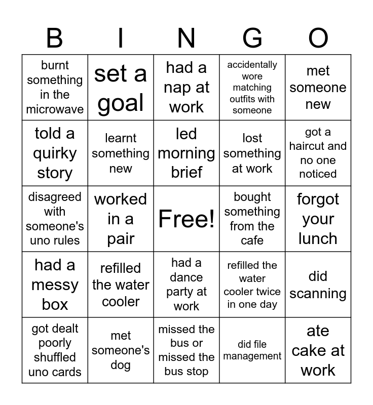 This bingo card has a free space and 32 words: did file management, did quality control, worked in a pair, answered a question during group session, had a messy box, learnt something new, met someone new, did scanning, set a goal, solved a problem, led morning brief, had a nap at work, asked questions to the zone during 1:1, won uno, bought something from the cafe, left early, got dealt poorly shuffled uno cards, disagreed with someone's uno rules, had a dance party at work, refilled the water cooler, refilled the water cooler twice in one day, watered the plants, forgot your lunch, met someone's dog, ate cake at work, accidentally wore matching outfits with someone, lost something at work, told a quirky story, burnt something in the microwave, missed the bus or missed the bus stop, made a new friend and got a haircut and no one noticed.