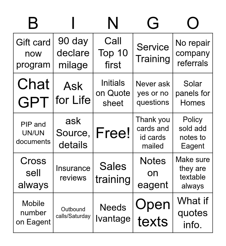 This bingo card has a free space and 35 words: 5 Star review, Text YES, Refferals, Ask for Life, Sales training, Service Training, Chat GPT, Mail good IR's, Initials on Quote sheet, Salvage vehicles, PIP and UN/UN documents, No repair company referrals, Onboarding workflow, Ivantage board, Gift card now program, Thank you cards and id cards mailed, Open texts, ask Source, details, Cross sell always, What if quotes info., Notes on eagent, Mobile number on Eagent, Make sure they are textable always, Outbound calls/Saturday, Call Top 10 first, Solar panels for Homes, Drivewise discount, 30-60 days future effective date, Never ask yes or no questions, Policy sold add notes to Eagent, Do not hang up on customer, Needs Ivantage, Insurance reviews, 90 day declare milage and Xdates send to Eagent always.