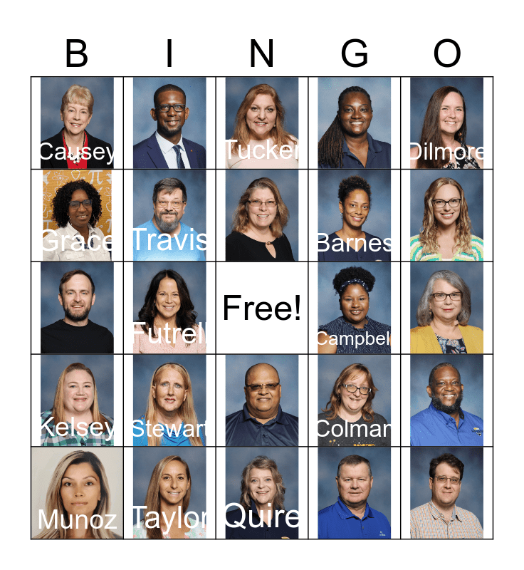 This bingo card has 29 images, a free space and 15 words: Munoz, Futrell, Causey, Tucker, Travis, Stewart, Campbell, Taylor, Quire, Kelsey, Dilmore, Colman, Efren, Barnes and Grace.