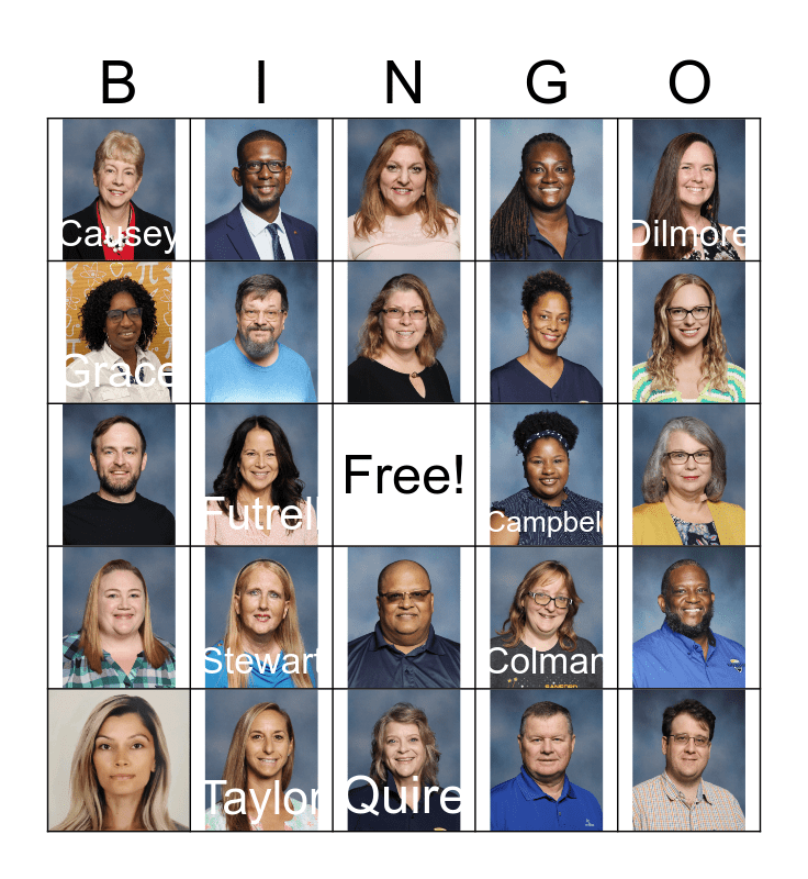 This bingo card has 29 images, a free space and 10 words: Futrell, Causey, Stewart, Campbell, Taylor, Quire, Dilmore, Colman, Efren and Grace.