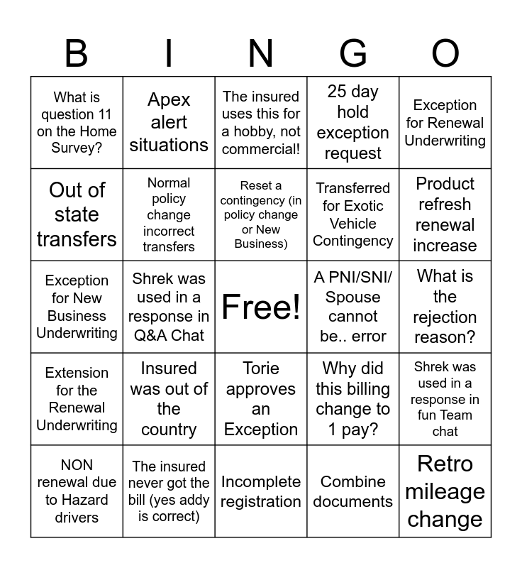 This bingo card has a free space and 24 words: Insured was out of the country, The insured never got the bill (yes addy is correct), Reset a contingency (in policy change or New Business), NON renewal due to Hazard drivers, Exception for Renewal Underwriting, What is question 11 on the Home Survey?, Out of state transfers, Apex alert situations, A PNI/SNI/ Spouse cannot be.. error, Torie approves an Exception, Transferred for Exotic Vehicle Contingency, Exception for New Business Underwriting, Why did this billing change to 1 pay?, Shrek was used in a response in fun Team chat, Normal policy change incorrect transfers, Combine documents, What is the rejection reason?, The insured uses this for a hobby, not commercial!, Product refresh renewal increase, Shrek was used in a response in Q&A Chat, Retro mileage change, Extension for the Renewal Underwriting, 25 day hold exception request and Incomplete registration.