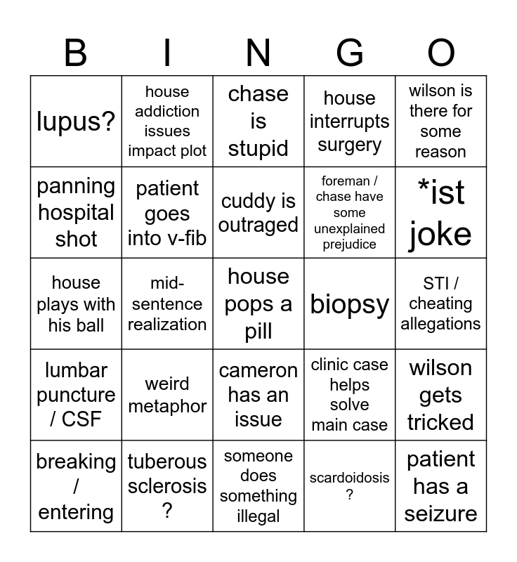 This bingo card has a free space and 29 words: breaking / entering, patient vomits blood, mid-sentence realization, random bleeding, lupus?, chase is stupid, patient goes into v-fib, weird metaphor, biopsy, tuberous sclerosis ?, STI / cheating allegations, patient has a seizure, someone does something illegal, scardoidosis ?, *ist joke, graphic surgery jumpscare, cameron has an issue, lumbar puncture / CSF, wilson is there for some reason, house plays with his ball, clinic case helps solve main case, unethical bet, foreman / chase have some unexplained prejudice, panning hospital shot, house interrupts surgery, house addiction issues impact plot, wilson gets tricked, cuddy is outraged and illegal/ unethical behavior.