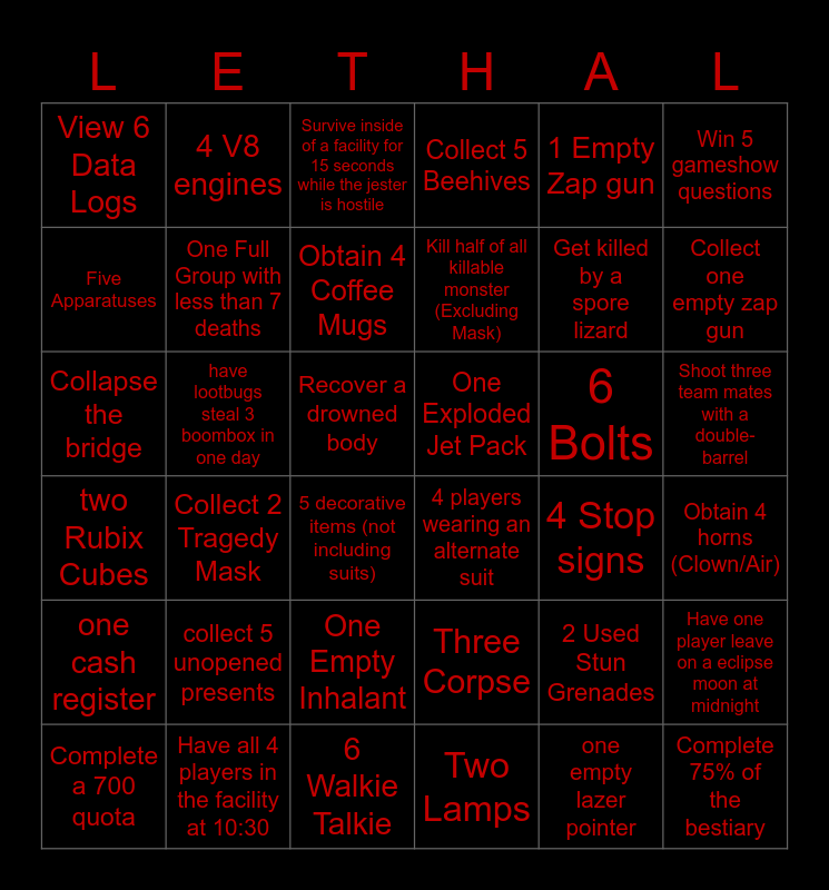 This bingo card has 36 words: Three Corpse, One Empty Inhalant, Two Lamps, Five Apparatuses, two Rubix Cubes, One Exploded Jet Pack, One Full Group with less than 7 deaths, 6 Walkie Talkie, 1 Empty Zap gun, 2 Used Stun Grenades, Collect one empty zap gun, Collect 5 Beehives, Have one player leave on a eclipse moon at midnight, have lootbugs steal 3 boombox in one day, Kill half of all killable monster (Excluding Mask), View 6 Data Logs, one cash register, 6 Bolts, Collapse the bridge, Survive inside of a facility for 15 seconds while the jester is hostile, Recover a drowned body, Collect 2 Tragedy Mask, 4 players wearing an alternate suit, 5 decorative items (not including suits), 4 Stop signs, 4 V8 engines, Get killed by a spore lizard, Have all 4 players in the facility at 10:30, Obtain 4 Coffee Mugs, Win 5 gameshow questions, Complete 75% of the bestiary, Complete a 700 quota, Obtain 4 horns (Clown/Air), Shoot three team mates with a double-barrel, collect 5 unopened presents and one empty lazer pointer.