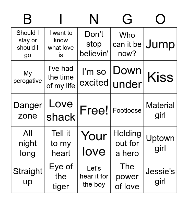 This bingo card has a free space and 24 words: Tell it to my heart, Eye of the tiger, I'm so excited, Straight up, Jump, Should I stay or should I go, My perogative, I want to know what love is, Footloose, Your love, Down under, Danger zone, Holding out for a hero, Uptown girl, I've had the time of my life, The power of love, Material girl, Don't stop believin', Kiss, Love shack, Jessie's girl, All night long, Who can it be now? and Let's hear it for the boy.