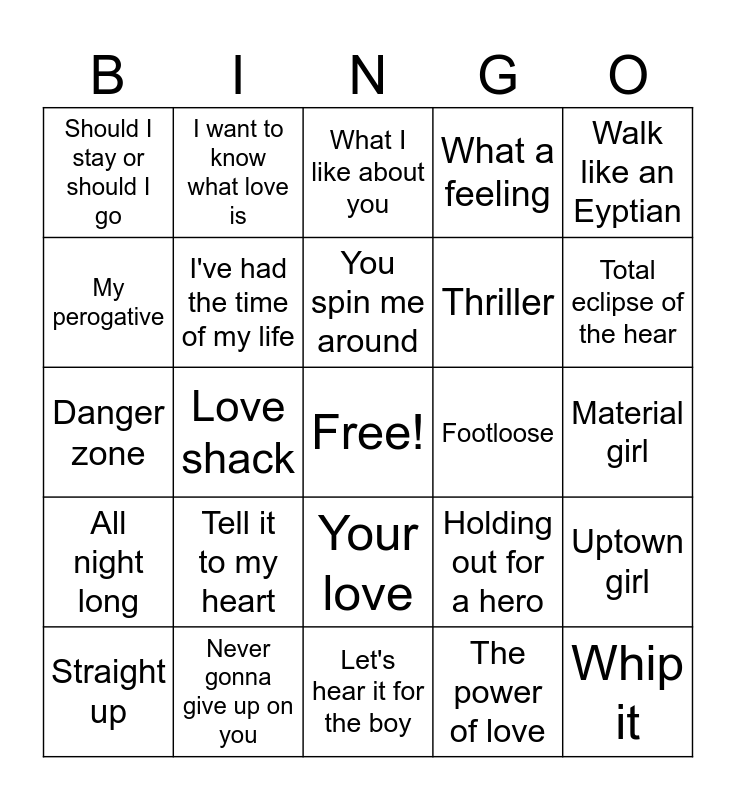 This bingo card has a free space and 24 words: Tell it to my heart, Never gonna give up on you, You spin me around, Straight up, Walk like an Eyptian, Should I stay or should I go, My perogative, I want to know what love is, Footloose, Your love, Thriller, Danger zone, Holding out for a hero, Uptown girl, I've had the time of my life, The power of love, Material girl, What I like about you, Total eclipse of the hear, Love shack, Whip it, All night long, What a feeling and Let's hear it for the boy.
