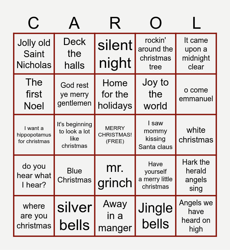 This bingo card has a free space and 52 words: All I want for christmas is my 2 front teeth, Angels we have heard on high, Auld Lang Syne, Away in a manger, Blue Christmas, Christmas song, Deck the halls, Ding Dong merrily on high, The first Noel, Frosty the snowman, God rest ye merry gentlemen, Good king Wenceslas, Hark the herald angels sing, Have yourself a merry little christmas, Here comes Santa claus, Holy jolly christmas, Home for the holidays, I saw mommy kissing Santa claus, I'll be home for christmas, It came upon a midnight clear, It's beginning to look a lot like christmas, Jingle bells, Jolly old Saint Nicholas, Joy to the world, let it snow, the little drummer boy, o christmas tree, o come all ye faithful, o come emmanuel, oh holy night, o little town of bethlehem, rockin' around the christmas tree, Rudolph the red nosed reindeer, santa claus is coming to town, sleigh ride, silent night, silver bells, the 12 days of chrstmas, we three kings, we wish you a merry christmas, winter wonderland, white christmas, do you hear what I hear?, feliz navidad, mr. grinch, last christmas, the most wonderful time of the year, I want a hippopotamus for christmas, baby it's cold outside, all I want for christmas is you, where are you christmas and please come home for christmas.