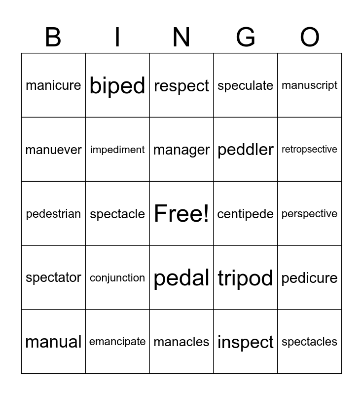 This bingo card has a free space and 24 words: conjunction, emancipate, manager, manual, manuscript, manicure, manuever, biped, centipede, pedal, peddler, pedestrian, tripod, pedicure, impediment, inspect, perspective, respect, retropsective, spectacle, spectacles, spectator, speculate and manacles.