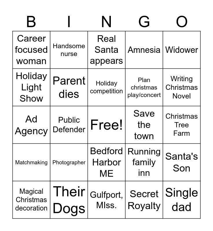 This bingo card has a free space and 62 words: Meet-Ugly, Their Dogs, Childhood friends, Matchmaking, Comes home for Christmas, Save their parents whatever, Parent dies, Plan Christmas part, Plan christmas play/concert, Pretend still a couple, Amnesia, Annual Christmas Festival, Holiday Light Show, Feud with another inn!, By the books guy with no time for romance, Career focused woman, Single dad, Widower, Former child star, Holiday competition, Save the town, Real Santa appears, Magical Christmas decoration, Secret Royalty, Save Family Inn, Grandmoather family reunion, Summit of santas, Secret Santa, Santa's Son, Owns a family inn, Speech writer, Owns family restaurant, Architect, Reindeer Farm, Christmas Tree Farm, Handsome nurse, Toy Store Owner, Cynical VP, Public Defender, Hotel Manager, Ad Agency, Children's Nonprofit, Photographer, Personal Shopper, Writing Christmas Novel, Running family inn, Professional decorator, Cheerful publicist, Flip house, Bridal Boutique, Bedford Harbor ME, Gulfport, MIss., Mapleton, Hope, Evergreen, Angel Falls, Fool's Gold, Yuletide Springs, Evergreen Lane, Bethlehem, Star Valley and Holly Village.