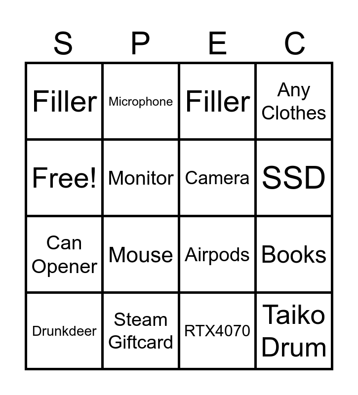 This bingo card has 16 words: Steam Giftcard, Books, Filler, Filler, Can Opener, Microphone, Airpods, RTX4070, Free!, Monitor, Drunkdeer, Any Clothes, Mouse, SSD, Camera and Taiko Drum.