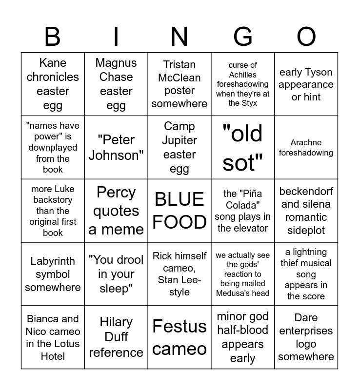 This bingo card has a free space and 24 words: "You drool in your sleep", Hilary Duff reference, Camp Jupiter easter egg, Bianca and Nico cameo in the Lotus Hotel, early Tyson appearance or hint, Kane chronicles easter egg, "names have power" is downplayed from the book, Magnus Chase easter egg, the "Piña Colada" song plays in the elevator, Rick himself cameo, Stan Lee-style, "old sot", more Luke backstory than the original first book, we actually see the gods' reaction to being mailed Medusa's head, a lightning thief musical song appears in the score, "Peter Johnson", minor god half-blood appears early, beckendorf and silena romantic sideplot, Tristan McClean poster somewhere, Arachne foreshadowing, Percy quotes a meme, Dare enterprises logo somewhere, Labyrinth symbol somewhere, curse of Achilles foreshadowing when they're at the Styx and Festus cameo.