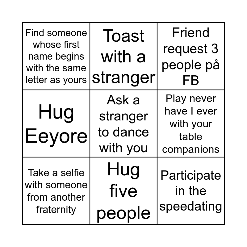 This bingo card has 9 words: Take a selfie with someone from another fraternity, Friend request 3 people på FB, Toast with a stranger, Hug Eeyore, Find someone whose first name begins with the same letter as yours, Play never have I ever with your table companions, Ask a stranger to dance with you, Participate in the speedating and Hug five people.