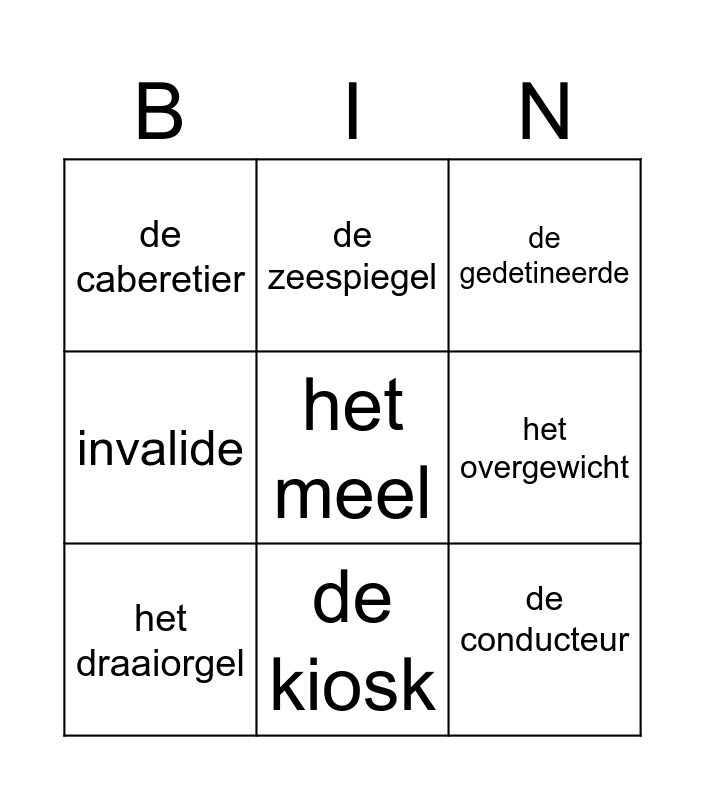 This bingo card has a free space and 8 words: het overgewicht, de gedetineerde, de zeespiegel, het draaiorgel, de caberetier, de conducteur, invalide and de kiosk.