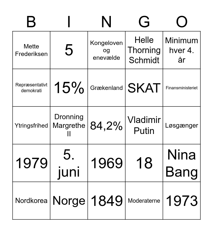 This bingo card has 46 words: Free!, 84,2%, 1915, 1849, 5. juni, 179, 5, Socialdemokratiet, Repræsentativt demokrati, Magtens tredeling, 15%, Helle Thorning Schmidt, Nina Bang, 18, Folketinget, Grundloven, Grækenland, Vladimir Putin, EU, Minimum hver 4. år, Dronning Margrethe II, Moderaterne, Mette Frederiksen, SKAT, Sort arbejde, Finansministeriet, Nordkorea, Danmark, 1969, 1979, 1970, 30 år, Mike Fonseca, 2024, Hockeystav, Norge, Løsgænger, 20.000, NATO, 1949, 1973, Kongeloven og enevælde, Ytringsfrihed, Skinke, Kim Jung Un and Donald Trump.