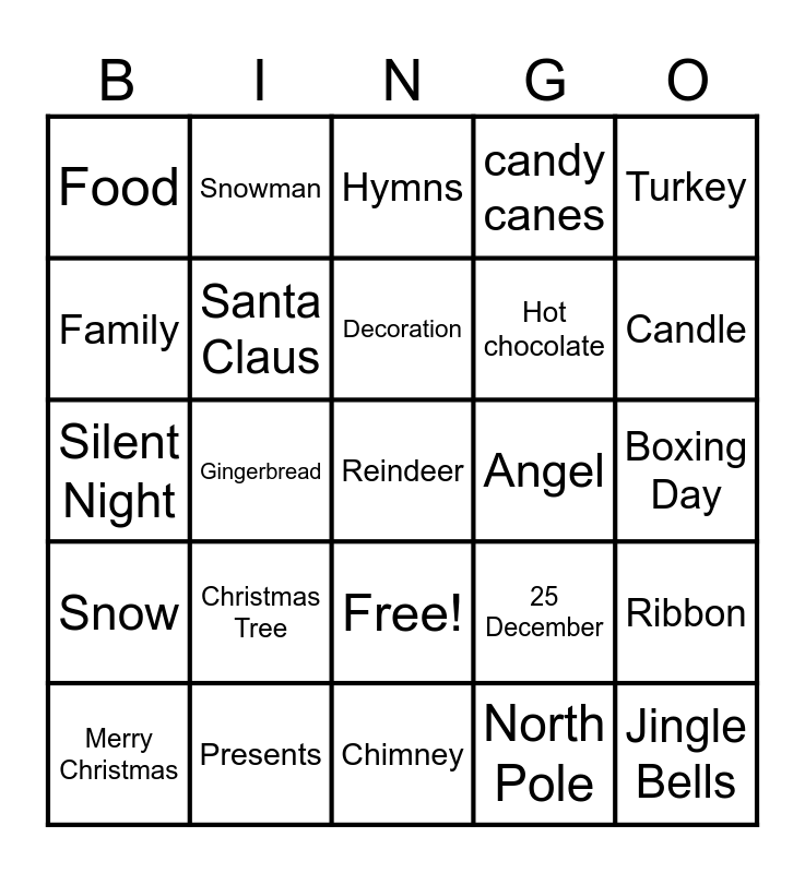 This bingo card has 27 words: Free!, Merry Christmas, Santa Claus, Paul Y., Hot chocolate, Turkey, Food, Christmas Tree, Decoration, North Pole, Boxing Day, Family, Presents, Chimney, Angel, Jingle Bells, Silent Night, Snowman, Reindeer, candy canes, Ribbon, Snow, Gingerbread, Hymns, 25 December, Candle and Fireplace.