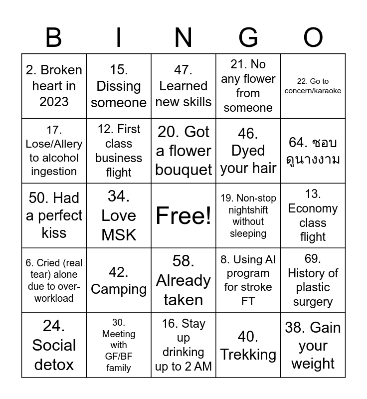 This bingo card has a free space and 73 words: Binggo Diag 2023, 1. Fallen in love in 2023, 2. Broken heart in 2023, 3. History of appendectomy, 4. Lose your weight, 5. Confess your love to someone, 6. Cried (real tear) alone due to over-workload, 7. Write a journal, 8. Using AI program for stroke FT, 9. Buy something (only one stuff) over 500,000 bath, 10. Listening to podcast, 11. Do yoga/workout/exercise, 12. First class business flight, 13. Economy class flight, 14. Fly over 10 times over this years, 15. Dissing someone, 16. Stay up drinking up to 2 AM, 17. Lose/Allery to alcohol ingestion, 18. Have a crush to someone, 19. Non-stop nightshift without sleeping, 20. Got a flower bouquet, 21. No any flower from someone, 22. Go to concern/karaoke, 23. Got drunken in this year, 24. Social detox, 25. Have pets, 26. Eating alone, 27. Watch movies alone, 28. Drinking alone, 29. Cuddle with someone, 30. Meeting with GF/BF family, 31. รักแฟนมากๆ เลยค้าบ, 32. No case after midnight, 33. Accidentally drop ultrasound probe (crying), 34. Love MSK, 35. Fight with someone/ clinician, 36. Buy gift for your BF/GF, 37. Haven't move on from your Ex(s), 38. Gain your weight, 39. Travel aboard, 40. Trekking, 42. Camping, 43. Cosplaying, 44. Wanna have a BF/GF, 45. Lost someone special, 46. Dyed your hair, 47. Learned new skills, 48. Asking for report result from clinician, 49. Volunteer, 50. Had a perfect kiss, 51. Got married this year, 52. Went to the beach, 53. Had over 30 cases per shift, 54. Drinking more than 2 cups of coffee, 55. Save the phone number of clinician and then search on line ID add friends, 56. Age over P’Him, 57. Age over 45 years old, 58. Already taken, 59. Never had a BF/GF, 60. LGBTQ++++++, 61. Age under 28 years old, 62. Love Neuro, 63. ชอบกินยำ, 64. ชอบดูนางงาม, 65. Love Intervent radiology, 66. Noodle lover, 67. Ramen lover, 68. Massage lover, 69. History of plastic surgery, 70. Prior CT/MRI, 71. เบิกยา รพ.เกิน 10,000 บาท/ครั้ง, 72. เคยเบิกยาให้ อ.หนู and 73. ไม่เคย teaching อ.หนู.