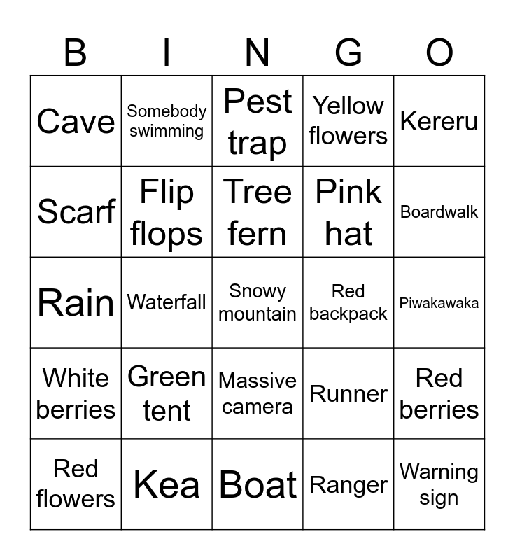 This bingo card has 30 words: Kea, South island robin, Waterfall, Shelter, Cave, Pest trap, Flip flops, Massive camera, Red backpack, Boat, Piwakawaka, Snowy mountain, Ranger, Warning sign, Boardwalk, Baby in backpack, Runner, White berries, Green tent, Kereru, Rain, Sun, Somebody swimming, Pink hat, Scarf, Yellow flowers, Red berries, Red flowers, Tree fern and Helicopter.