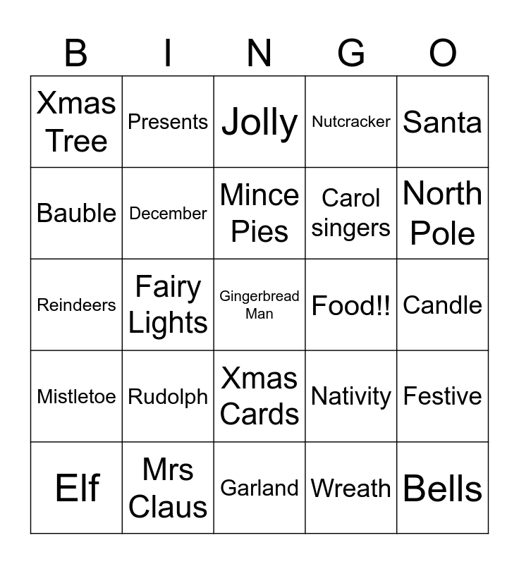 This bingo card has 25 words: Rudolph, Garland, Mince Pies, Elf, Santa, Xmas Tree, Bauble, Presents, Food!!, Xmas Cards, Carol singers, Reindeers, Nativity, Festive, December, Bells, Candle, Jolly, North Pole, Fairy Lights, Gingerbread Man, Mrs Claus, Mistletoe, Nutcracker and Wreath.