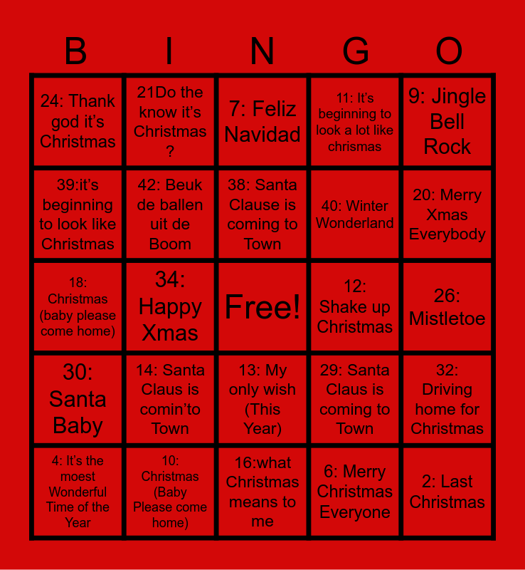 This bingo card has a free space and 43 words: 1: all I want for Christmas is you, 2: Last Christmas, 3: Sleigh Ride, 4: It’s the moest Wonderful Time of the Year, 5: Underneath the tree, 6: Merry Christmas Everyone, 7: Feliz Navidad, 8:Let It snow! Let is snow! Let is snow!, 9: Jingle Bell Rock, 10: Christmas (Baby Please come home), 11: It’s beginning to look a lot like chrismas, 12: Shake up Christmas, 13: My only wish (This Year), 14: Santa Claus is comin’to Town, 15: Why couldn’t it be Christmas everydat?, 16:what Christmas means to me, 17: Driving home to Christmas, 18: Christmas (baby please come home), 19: Rockong around the Christmas tree, 20: Merry Xmas Everybody, 21Do the know it’s Christmas ?, 22: It’s beginning a look a lot like Christmas, 23: Bring me love, 24: Thank god it’s Christmas, 25: Winter Wonderland, 26: Mistletoe, 27: Oh Santa!, 28: Wonderful Chrismastime, 29: Santa Claus is coming to Town, 30: Santa Baby, 31: Rudolph the red npse reindeer, 32: Driving home for Christmas, 33: Jingle bell rock, 34: Happy Xmas, 35: Christmas Time, 36 It’s gonna be a cold, cold, Christmas, 37: Home for the Holidays, 38: Santa Clause is coming to Town, 39:it’s beginning to look like Christmas, 40: Winter Wonderland, 41: Lets it snow! Lets it snow! Lets it snow!, 42: Beuk de ballen uit de Boom and 43: Flappie.