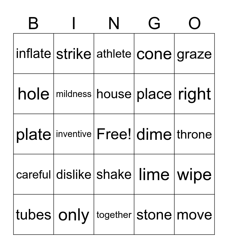 This bingo card has a free space and 24 words: dislike, only, house, tubes, graze, inflate, hole, strike, dime, shake, place, plate, lime, wipe, mildness, stone, throne, athlete, right, inventive, move, careful, cone and together.