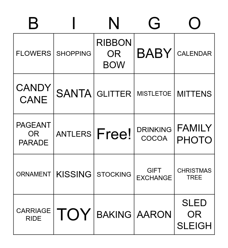 This bingo card has a free space and 25 words: KISSING, BAKING, GLITTER, CARRIAGE RIDE, CALENDAR, FLOWERS, CANDY CANE, SHOPPING, DRINKING COCOA, STOCKING, MISTLETOE, PAGEANT OR PARADE, GIFT EXCHANGE, CHRISTMAS TREE, SANTA, CUTE ANIMAL, FAMILY PHOTO, RIBBON OR BOW, MITTENS, ANTLERS, SLED OR SLEIGH, TOY, ORNAMENT, BABY and AARON.