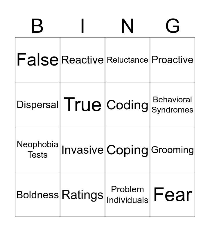 This bingo card has a free space and 15 words: Boldness, Fear, Reluctance, False, Behavioral Syndromes, Dispersal, Invasive, Problem Individuals, True, Neophobia Tests, Grooming, Proactive, Coding, Reactive and Ratings.