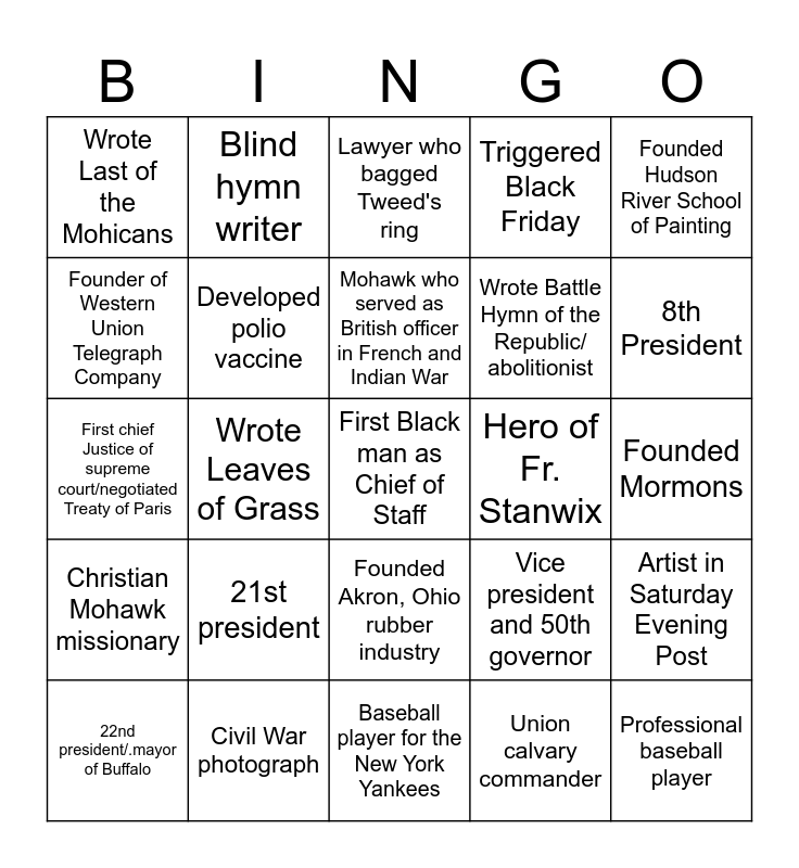 This bingo card has a free space and 24 words: 21st president, Civil War photograph, Mohawk who served as British officer in French and Indian War, 22nd president/.mayor of Buffalo, Founded Hudson River School of Painting, Wrote Last of the Mohicans, Founder of Western Union Telegraph Company, Blind hymn writer, Hero of Fr. Stanwix, Founded Akron, Ohio rubber industry, Wrote Battle Hymn of the Republic/ abolitionist, First chief Justice of supreme court/negotiated Treaty of Paris, Vice president and 50th governor, Artist in Saturday Evening Post, Developed polio vaccine, Union calvary commander, Founded Mormons, Lawyer who bagged Tweed's ring, 8th President, Wrote Leaves of Grass, Professional baseball player, Christian Mohawk missionary, Triggered Black Friday and Baseball player for the New York Yankees.