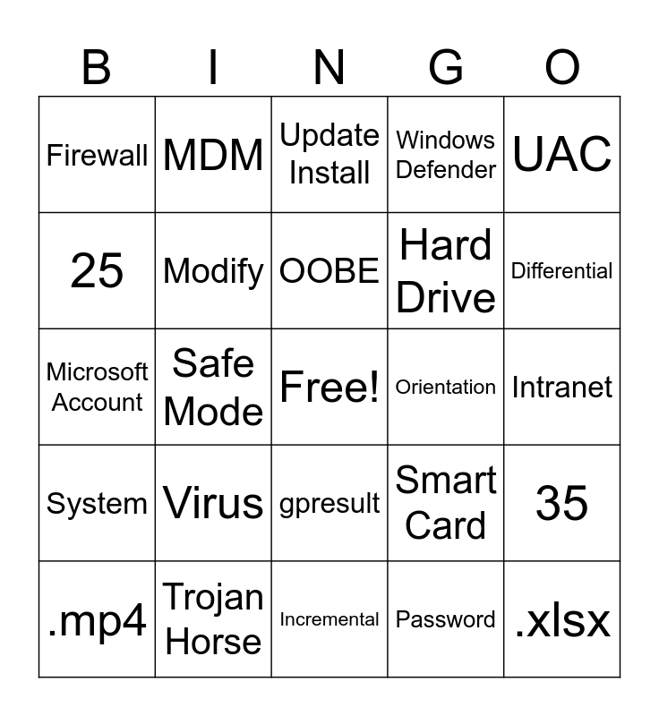 This bingo card has a free space and 72 words: GUI, MDM, Safe Mode, CPU, Night light, Driver, Windows Defender, Video Card, Hard Drive, 86.192.10.5, .mp4, Resolution, Differential, Firewall, Extranet, Microsoft Account, Smart Card, UAC, 30, Intranet, Virus, .xlsx, 35, VGA, Home Network, .pptx, Device Manager, Fingerprint Scanner, Command Line Interface, Full Control, Trojan Horse, Time and Language, .jpg, OneDrive, Password, 2FA, Write, Power Supply, 25, Safe Mode with Networking, gpresult, 192.168.10.169, Administrator, Eastern, .docx, System, Duplicate, ipconfig, MAM, HDMI, Custom Install, Teams, Worm, Orientation, Memory, McDonald's WiFi, Update Install, OOBE, Azure, gpupdate, Enroll, Hyper V, Local Account, Incremental, 169.254.2.251, Optical Drive, Modify, DisplayPort, .mp3, Sandbox, Boot Logging and Rollback.