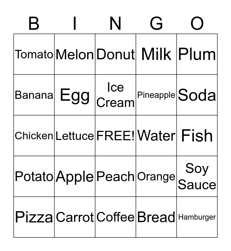 This bingo card has a free space and 24 words: Apple, Carrot, Ice Cream, Pizza, Plum, Tomato, Banana, Melon, Water, Peach, Pineapple, Chicken, Orange, Soy Sauce, Egg, Bread, Fish, Donut, Soda, Lettuce, Hamburger, Potato, Milk and Coffee.