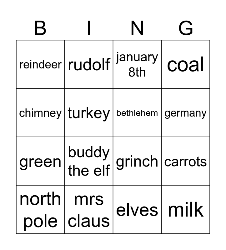 This bingo card has 27 words: boxing day, six, green, three, turkey, january 8th, rudolf, milk, mrs claus, christmas day, grinch, coal, presents, gold, buddy the elf, mistletoe, bethlehem, germany, sleigh, reindeer, elves, cookies, carrots, north pole, twelve, chimney and advent.