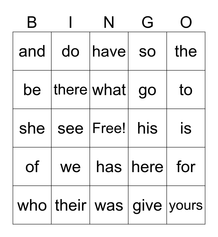 This bingo card has a free space and 44 words: your, yours, you, who, whose, give, have, live, the, their, so, his, has, we, me, was, look, she, said, to, do, are, like, and, or, is, thank, think, here, of, off, for, they, he, see, my, by, no, what, be, go, where, there and why.