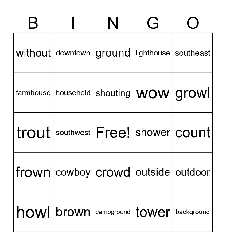 This bingo card has a free space and 49 words: around, background, compound, campground, cowboy, downhill, downtown, eyebrow, farmhouse, flower, household, lighthouse, outdoor, outside, playground, powder, shouting, shower, somehow, southeast, southwest, tower, without, wow, vow, growl, howl, crown, crowd, frown, gowns, owl, plows, clown, brown, now, scowl, towns, count, pouch, pound, scout, shout, sprout, trout, ground, mount, proud and ouch.