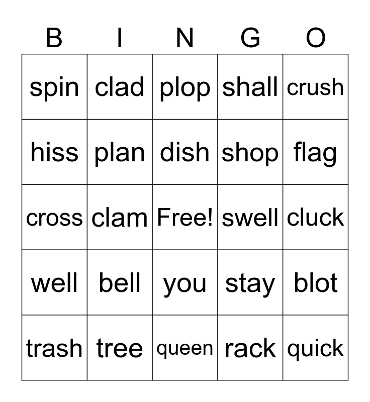 This bingo card has a free space and 34 words: tray, rack, slab, loss, well, plan, crush, trash, clad, stuck, dish, plop, slash, puff, swell, flag, tree, cross, bell, stay, you, from, spin, cluck, queen, quick, shall, still, shop, hiss, bliss, clam, blot and sock.
