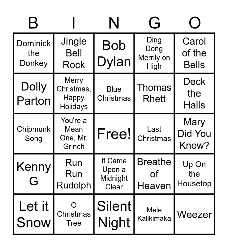 This bingo card has a free space and 49 words: Justin Bieber, Weezer, Julie Andrew, Silent Night, Run Run Rudolph, First Noel, Jingle Bell Rock, I Saw Three Ships, Dolly Parton, Have Yourself a Merry Little Christmas, Merry Christmas, Happy Holidays, Ding Dong Merrily on High, Up On the Housetop, Breathe of Heaven, Bruce Springsteen, Hallelujah, Blue Christmas, Last Christmas, Away in a Manger, Carol of the Bells, You're a Mean One, Mr. Grinch, Mele Kalikimaka, Dominick the Donkey, Thomas Rhett, Little Drummer Boy, Deck the Halls, Let it Snow, Andre Bocceli, It Came Upon a Midnight Clear, Kenny G, O Holy Night, God Rest Ye Merry Gentlemen, A Holly Jolly Christmas, All I Want for Christmas is You, O Christmas Tree, Sleigh Ride, All I Want…2 Front Teeth, Grandma Got Run Over, Mary Did You Know?, O Come O Come Emmanuel, Rudolph the Red Nose.., Celine Dion, The Beach Boys, I Want A Hippo..., Chipmunk Song, Bob Dylan, House Flight (Home Alone), 12 Days of Christmas and Jackson 5.