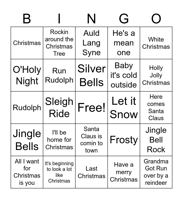 This bingo card has a free space and 24 words: I'll be home for Christmas, It's beginning to look a lot like Christmas, Silver Bells, All I want for Christmas is you, White Christmas, Christmas, O'Holy Night, Rockin around the Christmas Tree, Let it Snow, Santa Claus is comin to town, Baby it's cold outside, Rudolph, Frosty, Jingle Bell Rock, Run Rudolph, Have a merry Christmas, Here comes Santa Claus, Auld Lang Syne, Holly Jolly Christmas, Sleigh Ride, Grandma Got Run over by a reindeer, Jingle Bells, He's a mean one and Last Christmas.