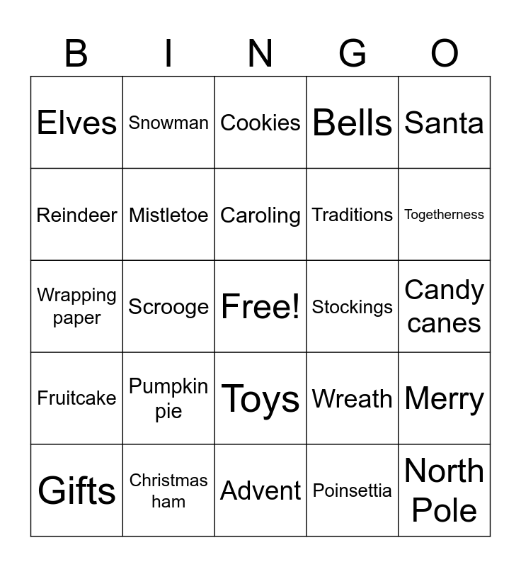 This bingo card has a free space and 24 words: Pumpkin pie, Christmas ham, Caroling, Gifts, Santa, Elves, Reindeer, Snowman, Stockings, Toys, Traditions, Wrapping paper, Wreath, Merry, Mistletoe, Poinsettia, Candy canes, Cookies, Togetherness, Scrooge, North Pole, Fruitcake, Bells and Advent.