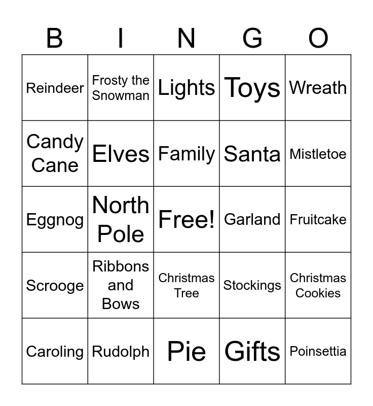 This bingo card has a free space and 24 words: Ribbons and Bows, Rudolph, Family, Caroling, Wreath, Reindeer, Candy Cane, Frosty the Snowman, Garland, Christmas Tree, Santa, Eggnog, Stockings, Christmas Cookies, Elves, Gifts, Fruitcake, Lights, Mistletoe, North Pole, Poinsettia, Scrooge, Toys and Pie.