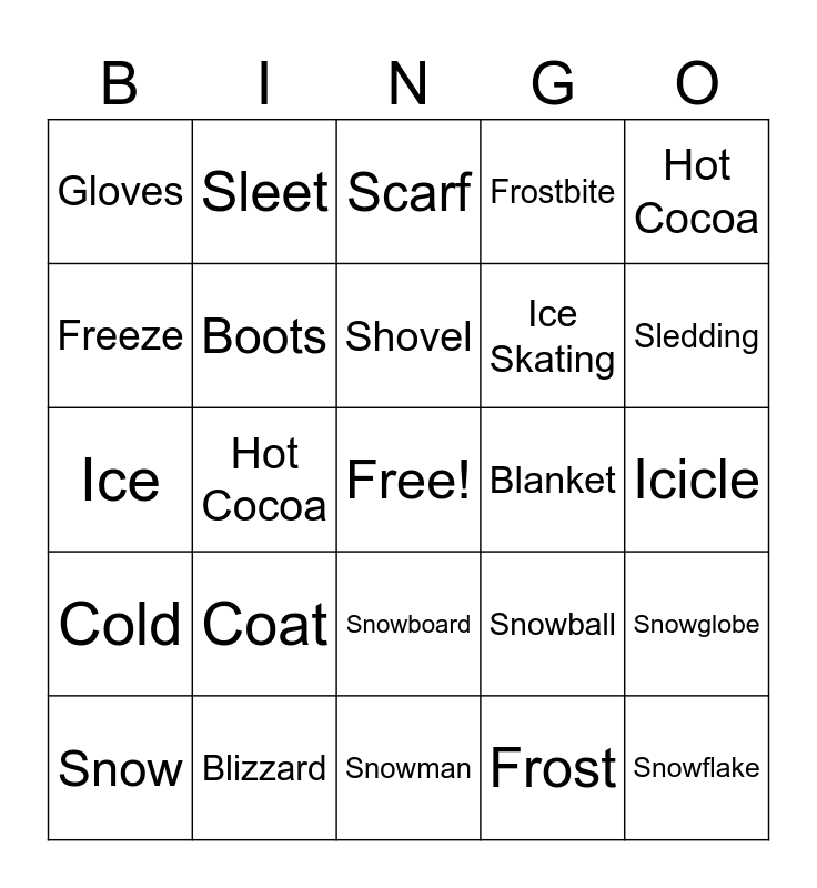 This bingo card has a free space and 29 words: Snow, Winter, Hot Cocoa, Hat, Gloves, Scarf, Boots, Coat, Blanket, Blizzard, Icicle, Snowflake, Snowman, Frost, Sledding, Skiing, Snowboard, Cold, Hot Cocoa, Ice, Snowball, Igloo, Ice Skating, Freeze, Frostbite, Sleet, Snowglobe, Shovel and Sweater.