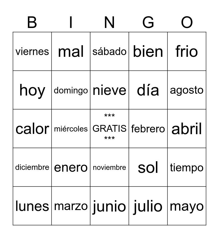 This bingo card has a free space and 29 words: lunes, martes, miércoles, jueves, viernes, sábado, domingo, enero, febrero, marzo, abril, mayo, junio, julio, agosto, septiembre, noviembre, diciembre, frio, calor, sol, hace, día, hoy, bien, mal, tiempo, nieve and luvia.