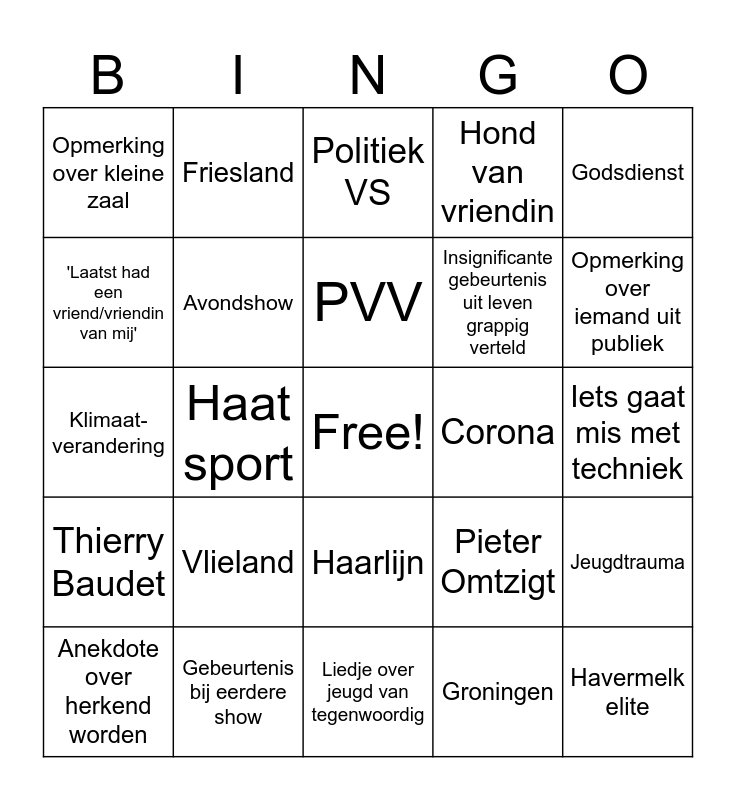 This bingo card has a free space and 24 words: Vlieland, Gebeurtenis bij eerdere show, PVV, Anekdote over herkend worden, Godsdienst, Opmerking over kleine zaal, 'Laatst had een vriend/vriendin van mij', Friesland, Corona, Haarlijn, Insignificante gebeurtenis uit leven grappig verteld, Klimaat-verandering, Pieter Omtzigt, Jeugdtrauma, Avondshow, Groningen, Iets gaat mis met techniek, Politiek VS, Opmerking over iemand uit publiek, Haat sport, Havermelk elite, Thierry Baudet, Hond van vriendin and Liedje over jeugd van tegenwoordig.
