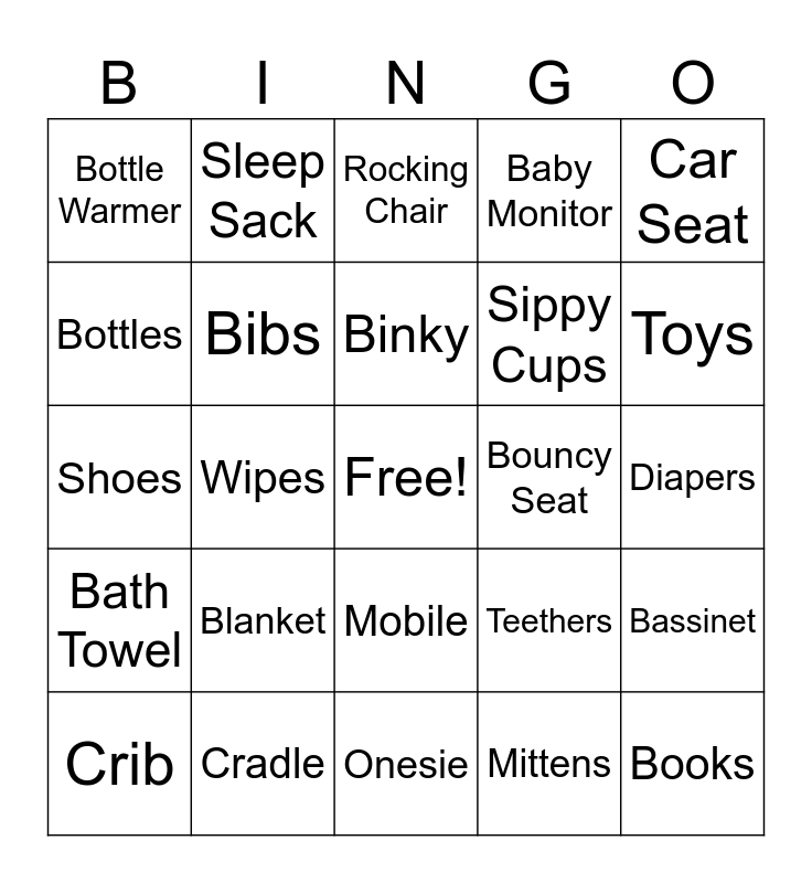 This bingo card has a free space and 39 words: Diaper Cream, Stroller, Bath Tub, Bibs, Crib, Mobile, Binky, Teddy Bear, Car Seat, Bath Towel, Wipes, Baby Monitor, Books, Diapers, Bouncy Seat, Blanket, Diaper Bag, Bottle Warmer, High Chair, Teethers, Bottles, Onesie, Sippy Cups, Toys, Rattle, Pacifier, Baby Powder, Baby, Swaddle, Sleep Sack, Baby Lotion, Burp Cloths, Rocking Chair, Cradle, Mittens, Pajamas, Bassinet, Shoes and Swing.