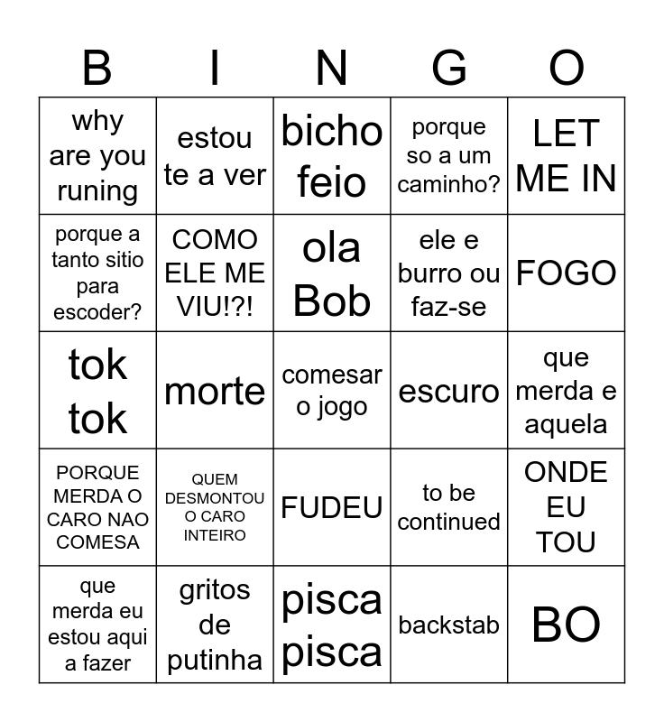 This bingo card has a free space and 30 words: gritos de putinha, ambiente de terror derrepente, morte, fazer coisas estupidas, why are you runing, bicho feio, COMO ELE ME VIU!?!, FUDEU, escuro, pisca pisca, que merda e aquela, BO, backstab, claramente aquilo nao e uma armadilha, FOGO, haaaa tanto medo, to be continued, PORQUE MERDA O CARO NAO COMESA, QUEM DESMONTOU O CARO INTEIRO, LET ME IN, tok tok, *porta a ranjer*, estou te a ver, ele e burro ou faz-se, porque a tanto sitio para escoder?, porque so a um caminho?, ONDE EU TOU, que merda eu estou aqui a fazer, ola Bob and Bob porque estas na vent?.