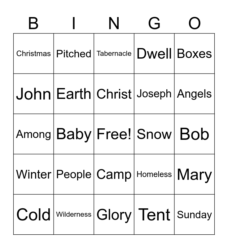 This bingo card has a free space and 28 words: Mary, Jesus, Joseph, Tent, John, Tabernacle, Pitched, Winter, Snow, Cold, Among, Dwell, Wilderness, Glory, Angels, King, People, Earth, Christ, Camp, Christmas, Eve, Sunday, Baby, Bob, Homeless, Boxes and Hark.